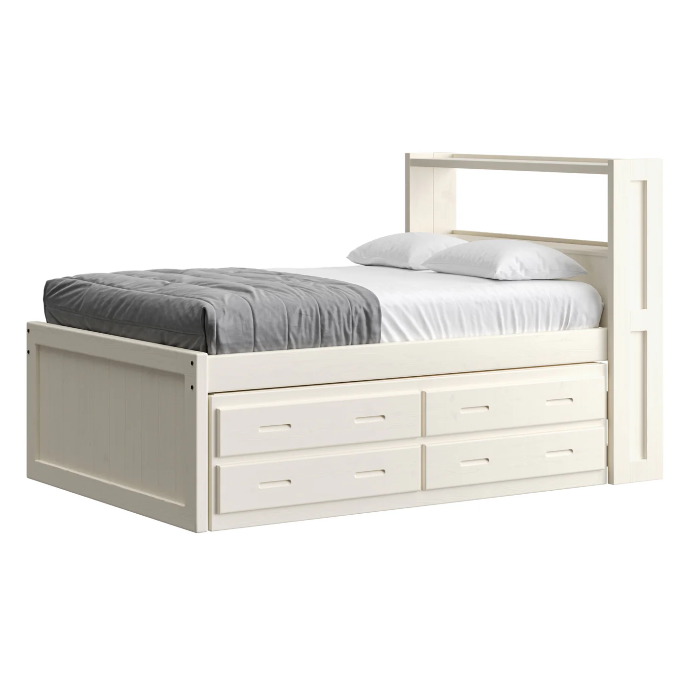 The set includes a 4 drawer unit. The drawer unit is sized to match the bed length that you choose and a second drawer unit can be added to the other side of any size bed for maximum storage. Available in all sizes. The bed is ready for a mattress, no foundation is required. When only one set of drawers is selected there will be an empty space on the other side and you will see the back of the set of drawers on the other side – Some find this a perfect storage space for suitcases, boxes, etc.