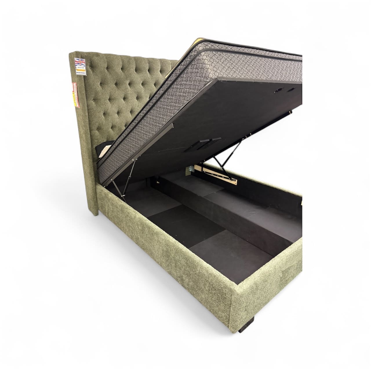 - Hydraulic lift up bed – No box spring required – Mattress stays on bed to access encased storage beneath